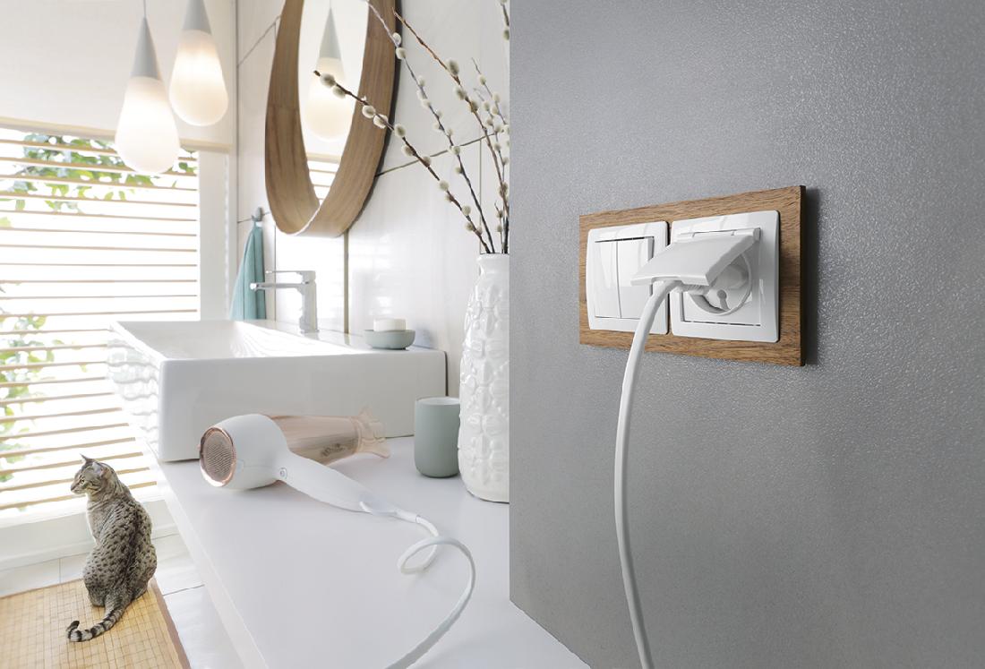 Fot. Seria DECO: ramka uniwersalna z drewna podwójna, dębowa + mechanizm łącznika świecznikowego biały i mechanizm gniazda bryzgoszczelnego z uziemieniem 2P+Z białe z klapką białą. Producent: Karlik Elektrotechnik Sp. z o.o.