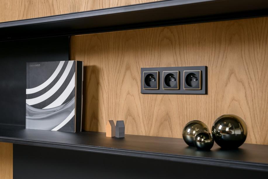 Fot. Seria MINI: ramka uniwersalna z tworzywa potrójna czarny mat + mechanizm gniazda pojedynczego z uziemieniem 2P+Z (przesłony torów prądowych) + ramka pośrednia złota. Producent: Karlik Elektrotechnik Sp. z o.o.